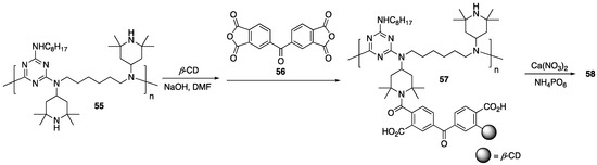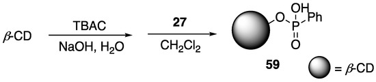 That same year, Fang and coworkers [82] described the covalent modification of β-CD with phenyl phosphonic acid dichloride 27 to form new phospholidpidated β-CD 59 (Figure 24). The reasoning behind this was the use of a P-containing β-CD would favor direct generation of phosphoric acid upon combustion. Modified β-CD 59 was then used as an FR additive to PLA and as a synergist in PLA-8 systems. Preparation of PLA composites were conducted through melt blending. The thermal stabilities of the samples were then analyzed using TGA. First, the authors compared the thermal behaviors of 59 and β-CD. β-cyclodextrin alone exhibited T5% of 316 °C and left ca. 11 wt % char residue at 700 °C. Modified β-CD 59 exhibited a ca. 60 °C decrease in T5% (due to decomposition of the P-moiety), but left behind app. 30 wt % char residue. This suggested that 59 may act as a competent FR additive. Composites of PLA and 59 were then studied. Pristine PLA exhibited a T5% value of 351 °C. Incorporation of 30 wt % 59 lowered the T5% by 66 °C. Additionally, this composite decomposed to leave higher char residue, albeit only 6.6 wt %. Synergistic effects of 59 with 8 were subsequently probed but first the authors found that composites of PLA with 8 (30 wt %) lowered the T5%% to 339 °C. Even though 8 promoted char formation, this char was unstable and further decomposed. The PLA composites with 30 wt % 8–59 (of varying ratios) led to increased char residue yields. Values close to 20 wt % could be achieved through the incorporation of 30 wt % 8–59 (2:1) and 30 wt % 8–59 (1:1). The authors deduced that this was from further esterification of hydroxyl groups of PCD with phosphoric acid generated from 8 decomposition.