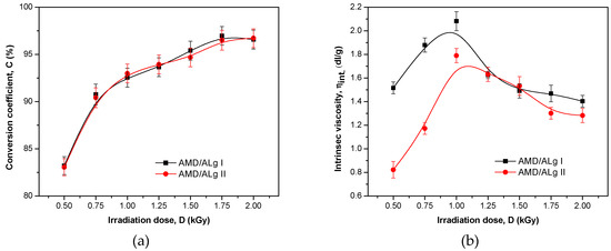 Conversion coefficient (a) and intrinsic viscosity (b) versus electron beam irradiation dose for AMD/ALg I and AMD/ALg II polymer types.