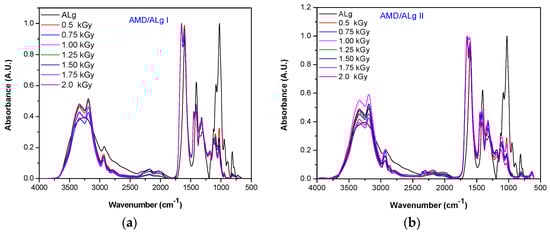 The band near 3400 cm−1 that corresponds to the stretching vibration of –OH groups of sodium alginate [,,,,] can be seen in both AMD/ALg I (Figure 3a,c) and AMD/ALg II (Figure 3b,d) spectra. On this band, modifications are observed in absorbance for samples obtained at the same irradiation dose as a function of sodium alginate concentration. For example, the samples obtained at the lowest irradiation dose present significant increases of the absorbance, while samples obtained at the highest irradiation dose present significant decreases of the absorbance (Figure 3c,d). The variation in intensity and the shifted appearance at 3192 cm−1 (Figure 3d) and 3191 cm−1 (Figure 3c), respectively, indicates the partial participation of hydroxyl groups in the chemical reaction []. By doubling the sodium alginate concentration in the irradiated samples, the intensities of all samples decreased, except for the intensity of AMD/ALg II/1 sample obtained by irradiation at 1 kGy (Figure 3d). This result indicates the formation of new bounds between –NH2 groups of polyacrylamide and carboxyl groups of alginate [].