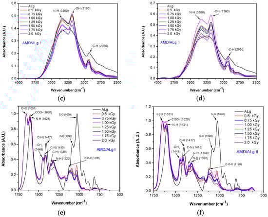 The FTIR spectra of AMD/ALg I (a) and AMD/ALg II (b) samples. Details of the AMD/ALg I (c), AMD/ALg II (d) spectra between 4000–2500 cm−1 and AMD/ALg I (e), AMD/ALg II (f) spectra between 1750–500 cm−1.
