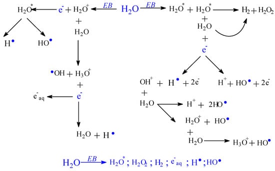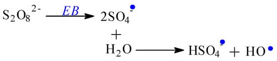 The ionizing radiation effects on monomers and polymers are the production of polymerization, cross-linking, grafting, and degradation reactions. After the interaction with monomer or polymer molecules, the electron beam, as ionizing radiation, produces, in addition to ionization, the excitation of the active species [,]. The energies associated with these phenomena are strongly dependent on the radiation dose. Free radicals are formed by the dissociation of molecules in the excited state or by the interaction of molecular ions. These can react through a direct connection with the polymer chains but can also initiate grafting reactions [,]. The formation of radicals by the decomposition of all reactants (initiator, solvent-water here and monomers) constitutes an advantage in the radiation induced reactions. In Figure 4, Figure 5, Figure 6 and Figure 7, decomposition of the reactants from the system is presented: Solvent-water radiolysis (Figure 4), initiator–potassium persulfate (Figure 5), and monomers-acrylamide (Figure 6) and sodium alginate (Figure 7). Even if in radio-induced polymerization the initiation of the reaction is done by irradiation, the initiators as potassium persulfate are used in order to optimize the monomer (AMD) conversion process [].