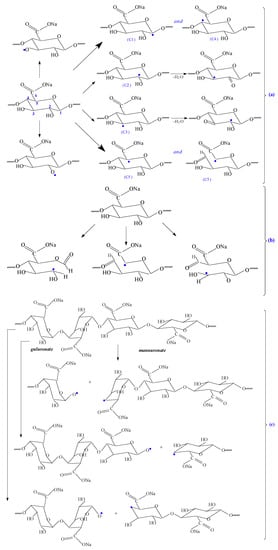 Chemical reactions presented in Figure 7a,b correspond to the mannuronate decomposition and are similar with the guluronate decomposition, the second group of sodium alginate.
