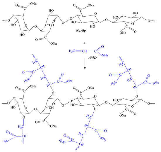 The materials used in experiments are shown in Table 1. Acrylamide (AMD), sodium alginate (ALg), and potassium persulfate (PP, used as initiator) were purchased from Sigma Aldrich (Redox Group Company, Bucharest, Romania) and were used without further purification. All other reagents used for polyelectrolytes preparation and characterization were of analytical grade and used as received. The Cu2+ and Cr6+ metal ions used in the metal ion removal studies were provided as CuSO4 and K2Cr2O7 by Sigma Aldrich also. These reagents of analytical grade were prepared with double-distilled water [].
