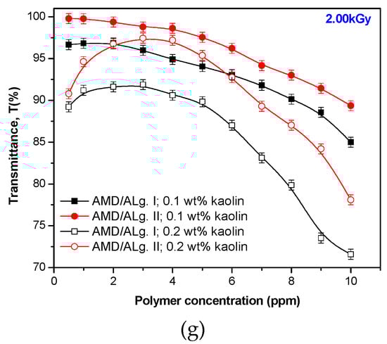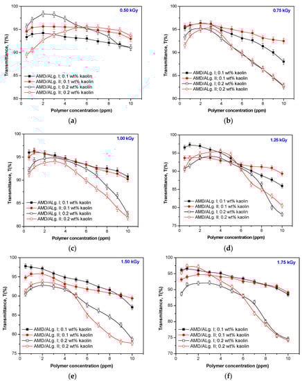 As seen in Figure 10, as the kaolin suspension is more concentrated, the polymers having higher sodium alginate content obtained at the irradiation dose between 0.75 and 1.75 kGy are more efficient. For the kaolin suspension of 0.2 wt %, the polymer concentration of 1 ppm is enough to obtain transmittances over 99%. For the kaolin suspensions of 0.05 and 1 wt %, the same tendency as in the first experiments set appeared. Only small polymer concentrations (around 1 ppm for 0.05 wt % and 2 ppm for 1 wt %, except for AMD/ALgII/0.5 and AMD/ALgII/1.5) led to the obtainment of transmittances up to 98%. By increasing the polymer concentration, the flocculation results were depreciated for both the 0.05 and 1 wt % kaolin suspension but keeping the tendency for the worst results as the kaolin concentration decreases.