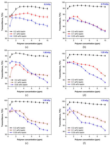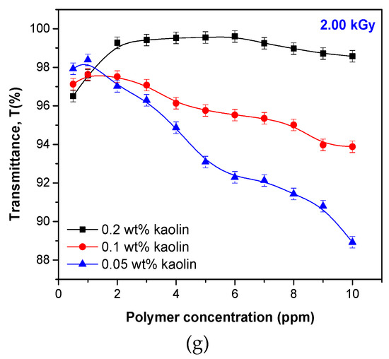 As seen in Figure 9, the increase of the polymer concentration over 4 ppm leads to the obtainment of transmittances that are increasingly small, irrespective of the irradiation dose at which the polymers were obtained or of the concentration of the kaolin suspension. In the range of polymer concentration from 1 to 4 ppm, transmittances over 90% were obtained for both 0.1 and 0.2 wt % kaolin suspensions.