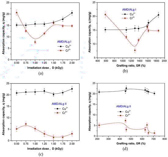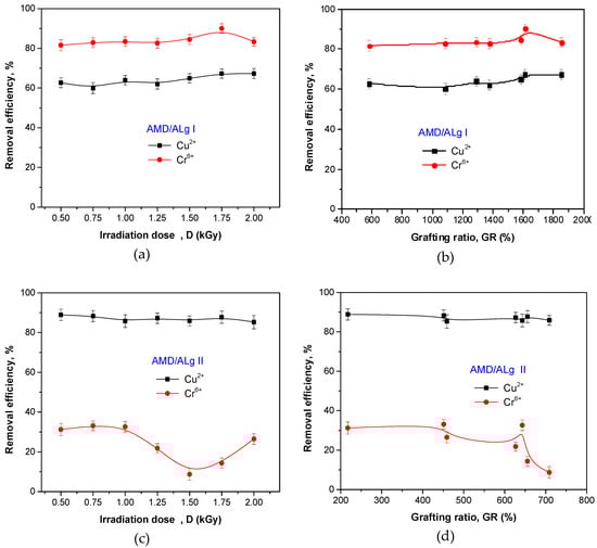 The influence of irradiation dose, grafting ratio, and sodium alginate concentration on Cu2+ and Cr6+ ion removal efficiency. (a) removal efficiency versus irradiation dose for AMD/ALg I samples; (b) removal efficiency versus grafting ratio for AMD/ALg I samples; (c) removal efficiency versus irradiation dose for AMD/ALg II samples; (d) removal efficiency versus grafting ratio for AMD/ALg II samples.