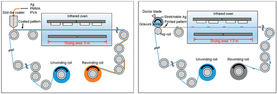 For a productive fabrication, the roll-to-roll process is known as the most promising among the printed electronics processes [27,28,29]. Figure 1 shows the schematics of the roll-to-roll processes. After unwinding of a flexible substrate, patterns are printed or coated on the substrate, and then dried. The patterned substrate is then rewound. The roll-to-roll process is a continuous one and does not stop during printing and drying. If printing/coating speed and viscosity of materials are not set properly, materials cannot be transferred to the substrate successfully, and so printability or coatability deteriorates [30]. If inappropriate drying condition of process and materials is applied, printed patterns will not dry before rewinding, and they will spread eventually [31]. For a high printability or coatability of patterns, the roll-to-roll process conditions and materials should be set carefully.