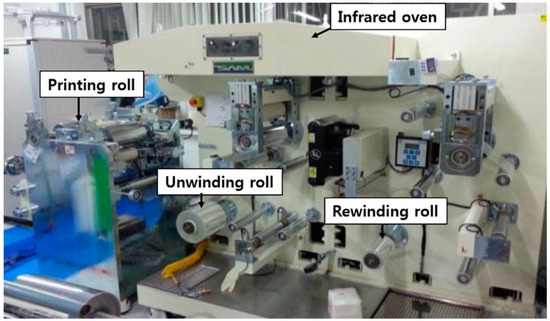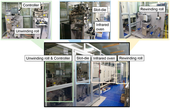 A silver ink (TEC-CO-021, InkTec, Ansan, Korea) was coated on the PET substrate with a roll-to-roll slot-die coater (Figure 3) at a speed of 0.5 m/min. The bottom electrode was then dried for 10 min at 100 °C in an infrared oven installed in the slot-die coater.