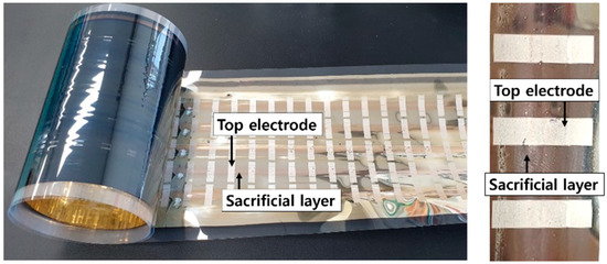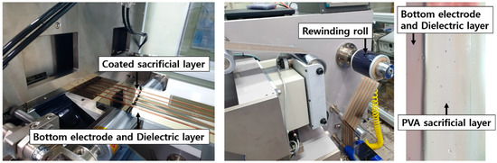 Polyvinyl alcohol (PVA; Comscience; Gwangju, Korea) was chosen as a material for the sacrificial layer as it is decomposable and removable in water [32,33]. A PVA powder (15 wt %) was dissolved in water. The solution of PVA was roll-to-roll slot-die coated at a speed of 0.5 m/min. Figure 4 shows the coating of the sacrificial layer. The sacrificial layer with a width of 10 mm was dried for 10 min at 70 °C in the infrared oven.