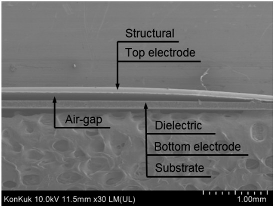 The thicknesses of the sacrificial layers of the five samples were measured from the FE-SEM images. As shown in Figure 8, the average thickness of the air-gap was 113.2 μm, while that of the sacrificial layer was 105.6 μm, which corresponds to an increase of 7.2%. The thickness of the air-gap was slightly increased owing to the expansion of the top electrode and structural layer by the buoyancy of water during the removal process of the sacrificial layer.