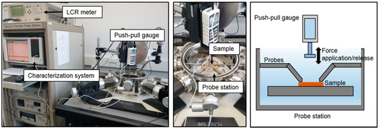 Electrical characteristics of the air-gap touch sensor samples were investigated using a push-pull gauge (Series 5, Mark-10, NY, USA), LCR meter (4284A, Hewlett-Packard, CA, USA), characterization system (4200-SCS, Keithley, OH, USA), and probe station (M7VC, MS tech, Hwaseong, Korea), as shown in Figure 9.