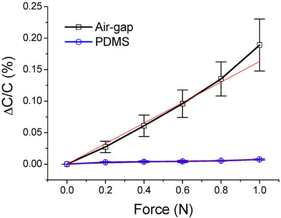 When no force was applied, the average capacitance of the air-gap touch sensor samples was 366.47 pF. The average ΔC/C was 0.19% when the force of 1 N was applied. For the PDMS-based touch sensor samples, the average ΔC/C was 0.0075% when the same force was applied. Based on the least-squares linear regression method, the sensitivity of the air-gap touch sensor was 0.1630%/N, while that of the PDMS-based touch sensor was 0.0074%/N. These results imply that the air-gap touch sensor samples have significantly higher sensitivities than those of the PDMS-based sensor samples.