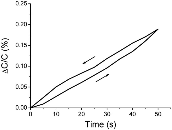 The second set of experiments was carried out to reveal the hysteresis characteristics of the air-gap sensor samples. The capacitances of the sensor samples were measured with the increase in the force in the range of 0 to 1 N at a rate of 0.02 N/s, followed by decrease to 0 at the same rate. The results are shown in Figure 11.