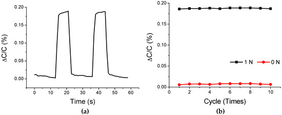 Capacitance change of the air-gap touch sensor during the repeated application of force: (a) switching of the input force; and (b) result of 10 time repetition of the switching process.