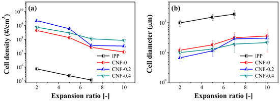 (a) Cell density and (b) average cell diameter of the neat iPP and polypropylene (PP)/CNF nanocomposite foams as a function of the expansion ratio.