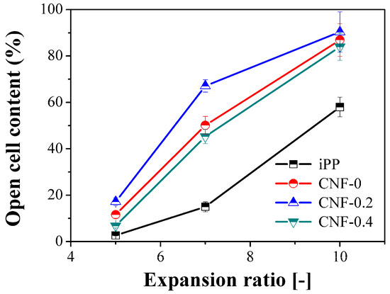 This can also be validated from the variation in the degree of opening of the cell in different samples. Figure 5 shows the effect of the expansion ratio on the open cell content (OCC) for iPP and PP/CNF composites. Compared with the iPP foams, adding both the native and modified CNF increased the OCC of PP foams, which was ascribed to the promoted cell nucleation caused by the enhanced crystallization and concurrent thinner cell wall [37,40]. In addition, the changing sequence of OCC was the same as the order of crystallization rate for iPP and PP/CNF composites [37]. Taking 7-fold foams as an example, the OCC for iPP, CNF-0, CNF-0.2, and CNF-0.4 foams was about 15%, 50%, 67%, and 45%, respectively, revealing that the added CNF could not only act as the cell nucleating agent, but also as the bubble opening agent for PP. Compared with the CNF-0 and CNF-0.2 samples, a relatively low OCC was achieved in the PP/CNF composite foams with the DS of 0.4. This can provide indirect evidence of the role of the formation of a network structure in stabilizing the cellular structure and diminishing cell breakage. In summary, the crystallization-promotion factor was dominant for preparing low expansion-ratio injection-molded foams since the cell nucleation process prevails over the foaming process, while the melt-strength-promotion factor dominates the production process for high expansion-ratio foams, whereas the foaming process is more related to the cell growth process and mold-opening operation.