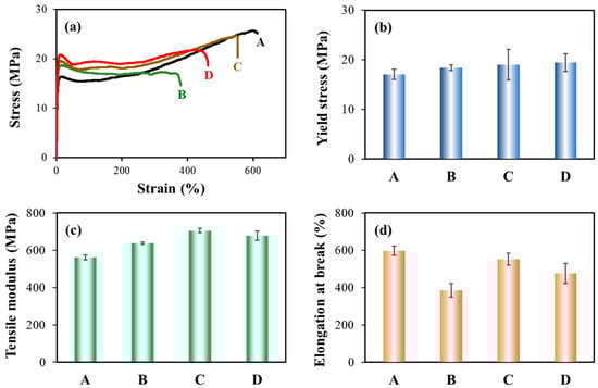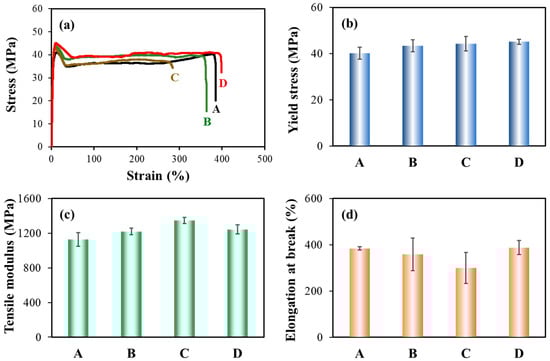Tensile results of the solid injection-molded parts: (a) typical stress–strain curves; (b) yield stress; (c) tensile modulus; and (d) elongation at break of (A) iPP, (B) CNF-0, (C) CNF-0.2 and (D) CNF-0.4 specimens.