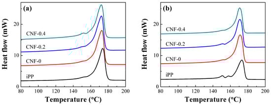The first heating curves of the core region for: (a) solid, and (b), 2-fold foamed iPP and PP/CNF nanocomposites.