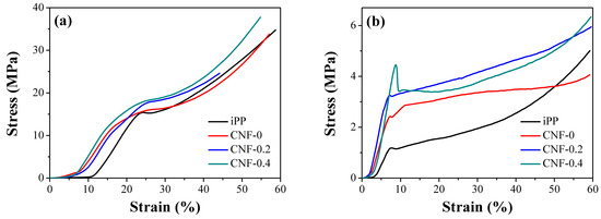 The mechanical properties of the neat iPP and PP/CNF composites were studied by the tensile tests. Firstly, we investigated the effect of CNF on the mechanical performance of the solid injection-molded PP. Figure 6 shows the obtained stress–strain curves, yield stress, tensile modulus, and elongation at break for the solid injection-molded products. As expected, pure iPP exhibited an obvious necking phenomenon and a ductile failure as shown in Figure 6a. A similar mode of ductile failure was observed for the PP/CNF nanocomposites. As for the solid iPP, the yield stress and tensile modulus were 40.2 MPa and 1126.9 MPa, respectively. The addition of native CNF to PP enhanced the yield stress and the tensile modulus of PP to 43.4 MPa and 1219.7 MPa, respectively. This reinforcement effect resulted from the well-known reinforcing mechanisms of stiff nanoparticles in a soft matrix, since the added fibers can support the stresses transferred from the polymer [43,44]. In contrast, the PP composites containing the modified CNF at a DS of 0.2, displayed a yield stress and tensile modulus of 44.3 MPa and 1346.9 MPa, respectively, which were about 10% and 20% higher than those of the iPP product. Similarly, the mechanical response of the CNF-0.4 sample was enhanced by 12% and 10% for yield stress and tensile modulus, respectively. Compared with the native CNF, a higher reinforcing efficiency was observed in PP composites with modified CNF. This greater improvement was attributed to the good interaction between modified CNF and PP, possibly resulting from the incorporation of the double alky chain structure of ASA into the surface of CNF [36,37]. Correspondingly, the elongation at break of PP was decreased by the incorporation of CNF, which was a typical behavior for the polymer composite with an added particle [43]. This decrease was more obvious for the CNF-0.2 sample, which reduced the elongation at break from 384% for iPP to 300% for the composites. This was similar to other systems of polymer mixed with filler, which was due to the decreasing deformability of a rigid interphase between the polymer resin and the stiff filler [36,43,44,45].