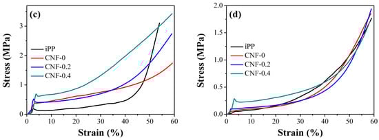 Characteristic stress–strain curves for foamed iPP and PP/CNF nanocomposites at the expansion ratios of: (a) 2-fold; (b) 5-fold; (c) 7-fold; and (d) 10-fold, respectively.