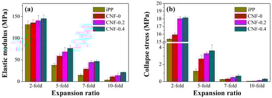 To understand the role of CNF, the elastic modulus and collapse stress were calculated for the iPP and PP/CNF composite foams. The elastic modulus was obtained from the slope of the initial linear elastic region of the stress–strain curve. Figure 10 shows the experimental results of elastic modulus and collapse stress of iPP and those of composite foams. As expected, the elastic modulus of all the foamed specimens decreased with an increase of the expansion ratio (Figure 10a), due to the density reduction and the larger cellular sizes. It also shows that the added CNF improved the elastic modulus of PP foams. The elastic modulus of 2-fold iPP, CNF-0, CNF-0.2, and CNF-0.4 foams were 131.4, 135.7, 149.4, and 145.3 MPa, respectively, which indicates a slight increase of elastic modulus at a low expansion ratio. Furthermore, comparing with the effect of CNF, the percentage increment of the composite foams with respect to the iPP was calculated and is shown in Figure 11. As shown in Figure 11a, compared with iPP, the percentage increment in the elastic modulus of CNF-0, CNF-0.2 and CNF-0.4 composites at the 5-fold expansion ratio were 56%, 81%, and 103%, respectively. As presented, the modified CNF always exhibited a higher elastic modulus than the native CNF, realizing our aim of improving the mechanical properties of PP with hydrophobic-modified CNF. In addition, among all the samples, CNF-0.4 had the highest elastic modulus and provided the strongest reinforcement effect for PP foams. This can be explained by the open cell content exhibited by the PP/CNF composites. It is known that the formation of opening cells has a negative impact on the mechanical performance of foams [51]. From the above SEM results, it was shown that the CNF-0.4 sample had the lowest open cell content, and thus the highest elastic modulus was achieved in the CNF-0.4 composite. Moreover, the added CNF had the highest percentage increase in elastic modulus for the 10-fold foam, reaching 204%, 288%, and 486% for CNF-0, CNF-0.2 and CNF-0.4, respectively. This clearly signified that the presence of CNF was extremely effective in reinforcing the mechanical properties of the high expansion-ratio foams.