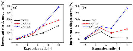 Percentage increment in mechanical response for the PP/CNF nanocomposite foams: (a) increments in elastic modulus, and (b) increments in collapse stress as a function of the expansion ratio.