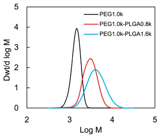 The molecular weight of PLGA, the PEG/PLGA ratio, and the molar ratio of lactide (LA) and glycolide (GA) (LA/GA ratio) in the PLGA block were analyzed from the 1H-NMR spectra and were summarized in Table 1. There was correspondence between the chemical shifts δ and the chemical structures as follows: δ 1.55 as (–OCH(CH3)CO–), δ 3.38 as (–OCH3), δ 3.60 as (–OCH2CH2–), δ 4.30 as (–OCH2CH2OCOCH2O–), δ 4.80 as (–OCH2CO–), and δ 5.20 as (–OCH(CH3)CO–). The molecular weight distribution of the synthesized PEG-b-PLGA was analyzed by GPC as shown in Figure 2, and the molecular weight of PEG-b-PLGA and the polydispersity (Mw/Mn) were summarized in Table 1. As shown in Figure 2, the molecular weight distributions of the synthesized PEG-b-PLGA diblock copolymers were monomodal. Therefore, it was confirmed that PEG-b-PLGA diblock copolymers with high PEG/PLGA ratio were successfully synthesized.