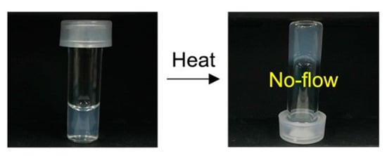 The sol and the gel states of the laponite/PEG-b-PLGA nanocomposite are shown in Figure 3. The nanocomposite displayed here is composed of 0.75 wt % of laponite and 3.0 wt % of PEG1.0k–PLGA1.6k. As shown in Figure 3, it was found that the laponite/PEG-b-PLGA nanocomposite responded to the temperature increase and exhibited the non-flow state at higher temperature. It should be noted that the PEG-b-PLGA solutions without laponite (i.e., the single-body PEG-b-PLGA solutions) were in the flow state (i.e., sol) regardless of the increase in temperature. Therefore, it was found that the thermo-responsive hydrogels could be obtained by using PEG-b-PLGA diblock copolymers with high solubility in water.