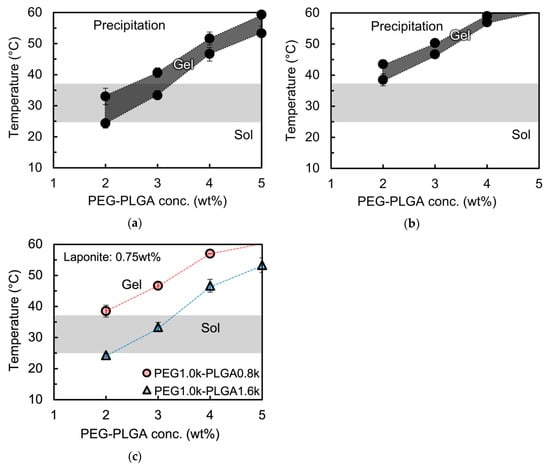 In order to enhance the solubility of PEG-b-PLGA in water, we decreased the PLGA molecular weight from 1600 to 800 g/mol and evaluated the thermo-responsive gelation behavior of the laponite/PEG-b-PLGA nanocomposites. Figure 4b shows the thermo-responsive gelation behavior of the laponite/PEG1.0k–PLGA0.8k nanocomposites. Even when the PLGA molecular weight decreased from 1600 down to 800 g/mol (i.e., the PEG/PLGA ratio increased from ~0.6 up to ~1.3), the critical concentration for gelation and the concentration dependency of the gelation temperature mentioned above were in good agreement with those of the laponote/PEG1.0k–PLGA0.8k nanocomposite.