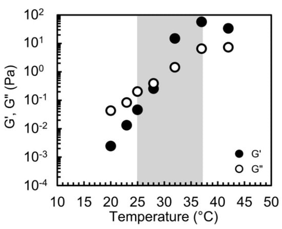 The thermo-responsive gelation of the laponite/PEG-b-PLGA nanocomposites was also quantitatively analyzed by DMA using a strain-controlled rheometer (ARES-G2, TA Instruments Japan Inc., Tokyo, Japan). A parallel plate and the Peltier plate of 50 mm in diameter were used for the measurement, and the gap between the plates was kept constant at 0.40 mm. Depending on the linear region of the specimens, the amplitude of strain was adjusted. The oscillatory frequency was set at 10 rad/s. The state of the specimen was analyzed as the gel state when G′ is larger than G″. The gelation temperature was defined as the crossover point of G′ and G″.