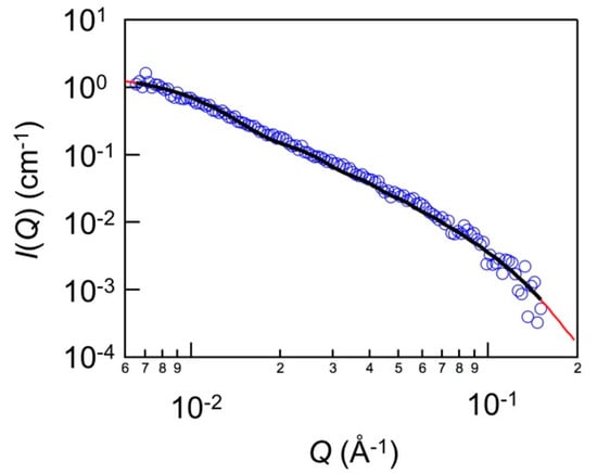Prior to the contrast-matching SANS experiments of the nanocomposites, the contrast-matching point for laponite in water was determined to be at the D2O fraction of 66% by systematically varying the D2O fraction in the D2O/H2O mixture as 0, 25, 50, 75, and 100% in the same manner as described in the previous literature [22]. Figure 7 shows an example of the SANS profile of laponite in water. It was confirmed that I(Q) decreased according to the power law of Q−2 as Q increased. That is, the existence of the disk-shaped objects was indicated. In order to analyze the SANS profile quantitively, the model based on the form factor for the thin disks was used for fitting the SANS profile. The model is written as follows: