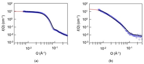 Figure 8 shows the SANS profile of PEG-b-PLGA diblock copolymers in the single-body PEG-b-PLGA solution (Figure 8a) and in the laponite/PEG-b-PLGA nanocomposites (Figure 8b). The results with PEG1.0k–PLGA0.8k are shown representatively. As shown in Figure 8a, I(Q) decreased according to the power law of Q−4 as Q increased. That is, the existence of the spherical objects was indicated. In order to analyze the SANS profile quantitively, the model based on the core-shell spherical model was used for fitting the SANS profile. The model is written as follows [23]: