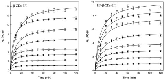 Amount of Direct Red 83:1 adsorbed by β-CDs-EPI and HP-β-CDs-EPI as function of contact time, for different dye concentrations. 25 mg/L (●), 50 mg/L (○), 75 mg/L (■), 100 mg/L (□), 150 mg/L (▲), 200 mg/L (Δ), 250 mg/L (♦) and 300 mg/L (⟡).
