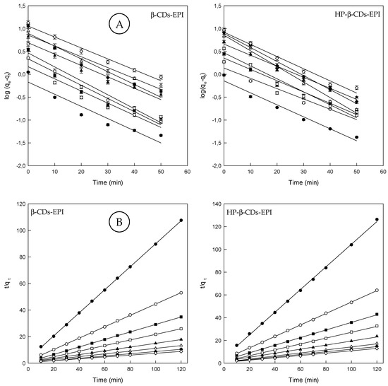 (A) Pseudo first order model plots and (B) pseudo second order model plots for the Direct Red 83:1 adsorption onto β-CDs-EPI and HP-β-CDs-EPI polymers at different dye concentrations (25 mg/L (●), 50 mg/L (○), 75 mg/L (■), 100 mg/L (□), 150 mg/L (▲), 200 mg/L (Δ), 250 mg/L (♦) and 300 mg/L (⟡)).