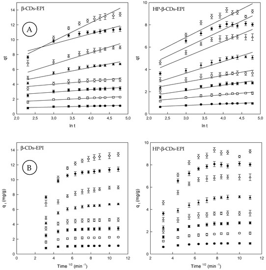 (A) Elovich model plots for the Direct Red 83:1 adsorption onto β-CDs-EPI and HP-β-CDs-EPI polymers. (B) Intraparticle diffusion model plots for the Direct Red 83:1 adsorption onto β-CDs-EPI and HP-β-CDs-EPI polymers at different dye concentrations (25 mg/L (●), 50 mg/L (○), 75 mg/L (■), 100 mg/L (□), 150 mg/L (▲), 200 mg/L (Δ), 250 mg/L (♦) and 300 mg/L (⟡)).