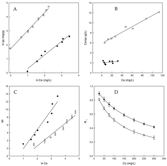 Adsorption isotherms for Direct Red 83:1 by β-CDs-EPI (●) and HP-β-CDs-EPI (○). (A) Freundlich isotherm, (B) Langmuir isotherm, (C) Temkin isotherm, (D) Separation factor.