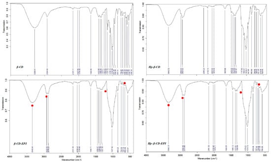 The stretching vibrations of OH, CH2 and C–O–C are around 3342.48, 2923.34, 2878.29, and 1083.79 for β-CD-EPI, and 3348.23, 2922.92, 2876.86 and 1089.57 for HP-β-CD-EPI, respectively; verify the presence of cyclodextrin in the structure.