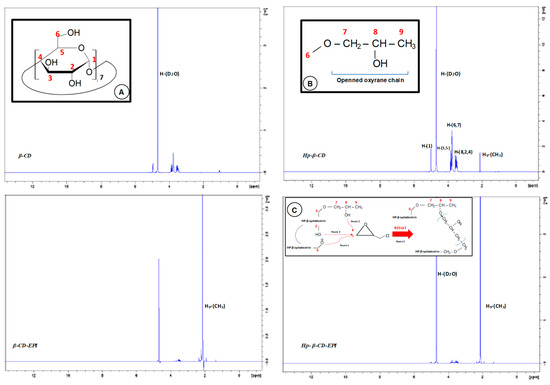 1H-NMR spectra of β-CD, HP-β CD, β- and HP-β-CD EPI polymers. Inset: A: β-CD monomer glucose unit chemical structure; B: HP-β-CD spacer arm; C: Possible ways to open oxyrane ring by OH groups.