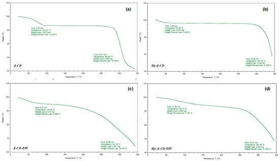 In addition, the TG curves for β-, HP-β-CDs and their polymers were carried out. The TG curve for β-, HP-β-CDs (Figure 8A,B) revealed three mass loss zones.