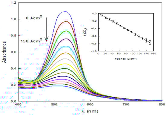 Cyclodextrin polymers do not adsorb all the amount of dyes present in water. Therefore, a complementary process was tested in order to further reduce the quantity of dye that would be released into the environment. To this end, dye degradation by an innovative AOP where the light source is a pulsed light system was tested [17]. The process was able to degrade Direct Red 83:1 efficiently, as it can be observed in the flattening of the visible light spectrum (Figure 9). The degradation followed a pseudo-first order kinetics (Figure 9, inset) (R2 = 0.9998) with a decolorization constant of 0.0052 cm2/J. The concentration of Direct Red 83:1 in water was reduced by >80% by this process with the application of 150 J/cm2. Furthermore, the degradation kinetics let think that nearly full degradation is achievable by extending the treatment time.