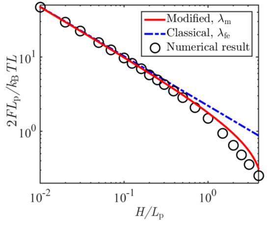 Chen and his coworkers [19,31,32] have proposed an iteration method to numerically determine the ground state eigenvalue and eigenfunction. In this study, we adopted this method to calculate the confinement free energy. As examples, we considered polymer chains confined in slits with different heights H. When using Chen’s method to calculate we set the tolerance error as . Figure 2 shows the comparison of the confinement free energy as a function of H/Lp obtained by numerical solutions of the ground state eigenvalue, Equation (15), and Equation (2) in terms of the classical Odijk length. It can be seen from Figure 2 that free energy based on the modified deflection length had a better agreement with the numerical results than that based on the classical one.