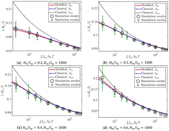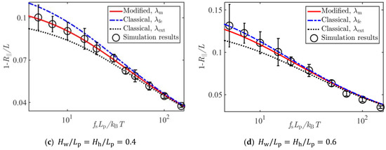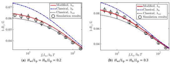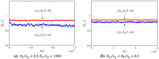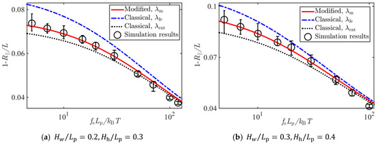 Figure 4 shows the comparison of Brownian dynamics simulation results and corresponding theoretical predictions based on the classical deflection length as shown in Equation (17) and based on the modified deflection length in Equation (16) for the normalized average extension of the WLCs confined in square tubes of different sizes without stretching. Simulation parameters are listed in Table 2. It can be seen from Figure 4 that the prediction in terms of the modified deflection length agreed well with the simulation results, and could be reduced to that of the classical one at a tight confinement limit. For the case of a large Hw/Lp, the prediction in terms of the classical deflection length exhibited a large discrepancy with the simulation results.