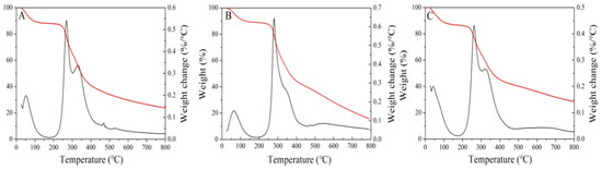 The thermogravimetric analysis of N. flagelliforme polysaccharides. (A–C) represent the WL-CPS, NaCl-CPS and Glu-CPS, respectively.