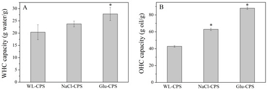 The water-holding capacity (A) and oil-holding capacity (B) of polysaccharides. * Statistically different from the WL-CPS (P < 0.05).