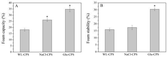 The foam capacity (A) and foam stability (B) of polysaccharides. * Statistically different from the WL-CPS (P < 0.05).