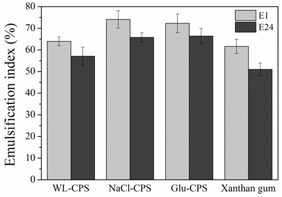 The ES of WL-CPS, NaCl-CPS and Glu-CPS decreased after 24 h and reached about 57.12%, 65.78% and 66.39%, respectively. This property was related to hydrophobic compounds and the size of the droplets in an emulsion based on food products [5]. In addition, the emulsion stability was proportional to the molecular weight and the uronic acid concentration [41]. ES had a positive effect on its physical stability, such as flocculation, gravitational separation and coalescence [5]. The emulsifying ability of NaCl-CPS in stabilizing emulsions might promote its applications as a bioemulsifier in numerous industrial areas.
