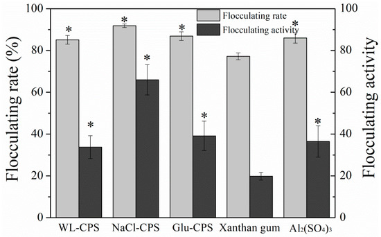 Flocculants are classified as inorganic flocculants, synthetic organic flocculants and bioflocculants from biological resources, which are widely used in the chemical and mineral industries, wastewater treatment and food and fermentation processes. The flocculating activity of polysaccharides from different culture conditions in the kaolin suspension was compared with other commercial flocculants (Al2(SO4)3 and xanthan gum). These preliminary tests were performed at room temperature and neutral pH with the flocculant concentration of 0.5 mg/L in kaolin suspension. As shown in Figure 7, NaCl-CPS had the highest flocculating activity (65.95) and flocculating rate (91.81%), followed by Glu-CPS (flocculating activity of 39.15 and flocculating rate of 86.84%) and Al2(SO4)3 (flocculating activity of 3.3 and flocculating rate of 79.8%). Xanthan gum had the lowest flocculating activity (19.86) and flocculating rate (77.19%). These results indicate that the polysaccharides have the high flocculating activity, especially NaCl-CPS, which envisages its potential use as a bioflocculant for colloid and cell aggregation in several applications, such as water treatment, food and mining industries and industrial downstream processing.