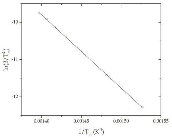 As one can observe in Figure 2, the correlation between versus 1/Tm is very accurate and it allows for estimating a single value of Ea. In particular, the Ea value obtained was 163.1±1.0 kJ mol−1 with a correlation coefficient r = −0.9998. One of the assumptions of this method is that does not change with . In fact, it is giving Ea at a particular conversion m = 0.531. The Kissinger method gives a reliable value of Ea if m does not change in a significant way with the heating rate, . On the other hand, the systematic error decreases with increase of the reduced temperature x = Ea/RT. In this particular case, x was comprised between 27.40 and 29.95 for the corresponding Tm values. As it has been reported, x values higher than 10 lead to an error of less than 5% in Ea [41,42].