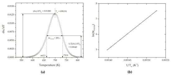 There is a direct relationship between the peak width, measured as the time corresponding to the full width at half maximum (tFWHM) of the curve that is shown in Figure 3a, and the time scale factor corresponding to the peak temperature (Tm), m (Equation (42)).