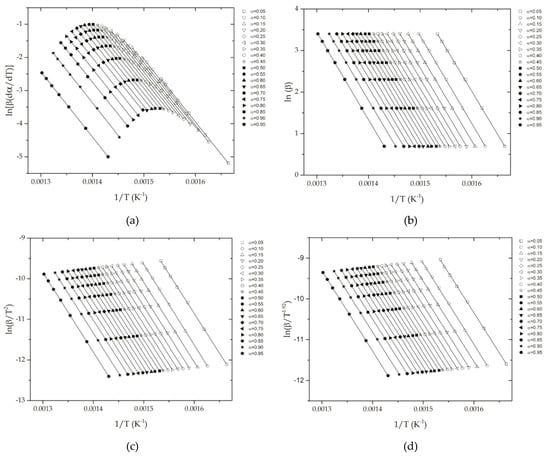 Linear plots corresponding to fitting of experimental data in isoconversional conditions: (a) Friedman method showing a plot of vs. 1/T; (b) Flynn-Wall-Ozawa (FWO) method showing a plot of vs. 1/T; (c) Kissinger-Akahira-Sunose (KAS) method showing a plot of 1/T; and (d) Starink method showing a plot of vs. 1/T.